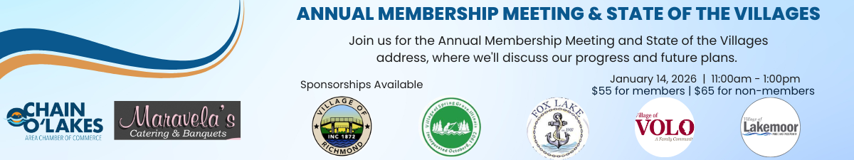 Join us for our Annual Membership Meeting and State of the Villages, a special gathering bringing together community leaders,businesses, and partners from across the region. This year's event will feature a panel discussion with the Mayors of Richmond, Spring Grove, Fox Lake, Volo, and Lakemoor offering insights into the latest developments, challenges, and opportunities in their villages.